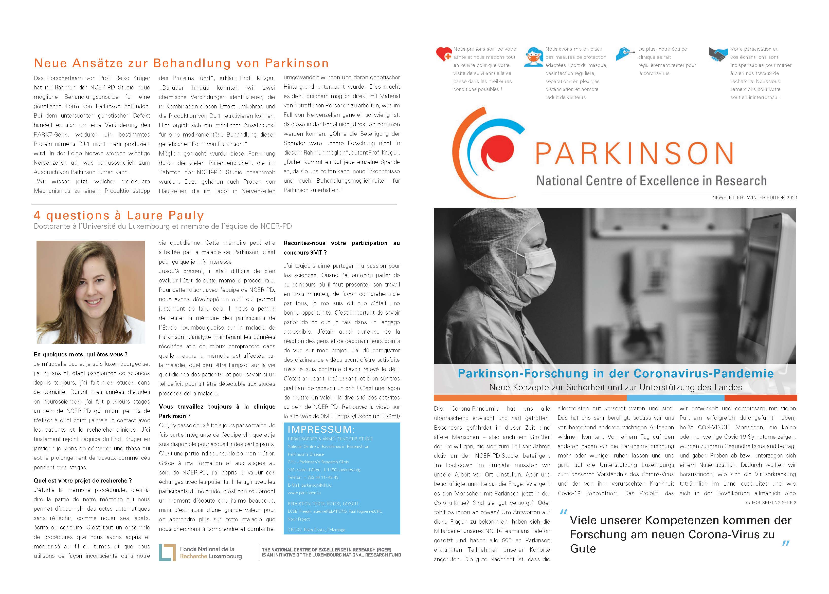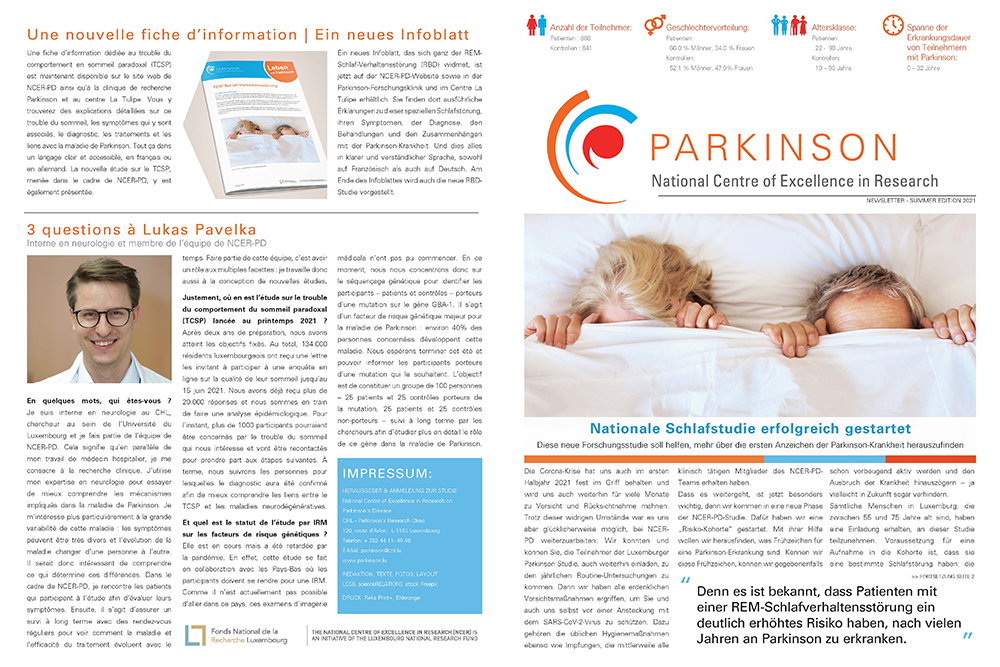 Der NCER-PD Newsletter ist ein halbjährlich erscheinender Newsletter, der an die Teilnehmer der Luxemburger Parkinson Studie sowie an Beschäftigte im Gesundheitswesen gesendet wird. Ziel ist es, durch einen Leitartikel des Koordinators Dr. Krüger, Interviews mit Mitgliedern des NCER-PD-Teams sowie Artikel über Forschungsprojekte über den aktuellen Stand der Wissenschaft zu informieren